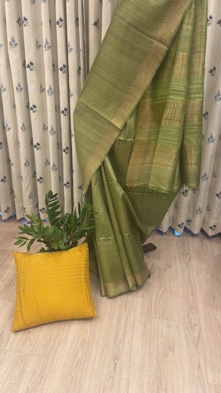 Light green plain body with 2inch jari border pure Tussar. Stunning sequins pallu