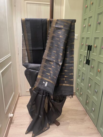 Charcoal coloured pure Tussar with 2” border and jari work in Anchal only.. soft blouse piece