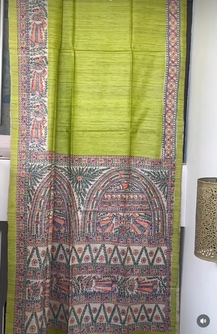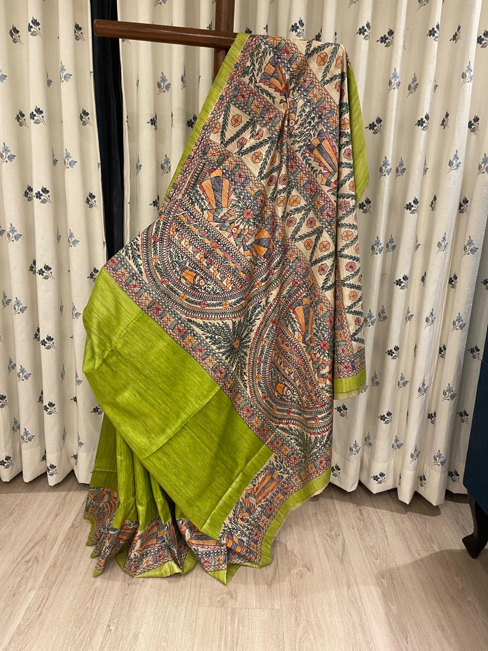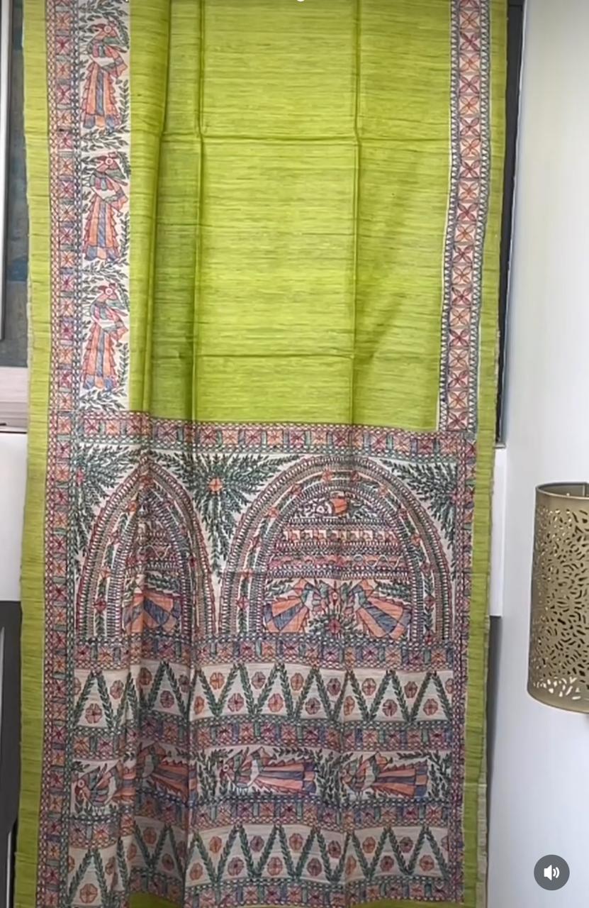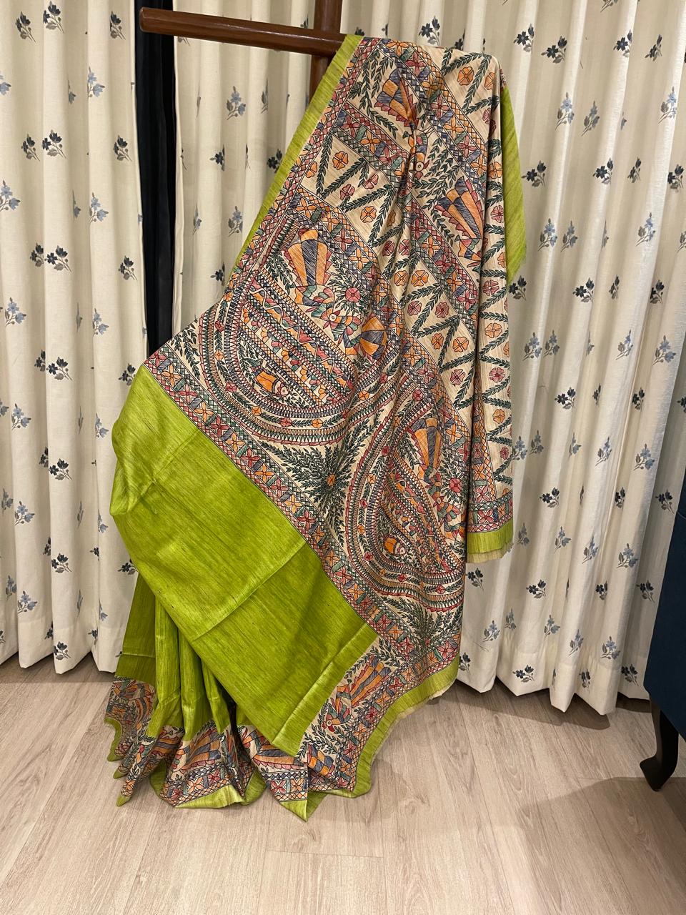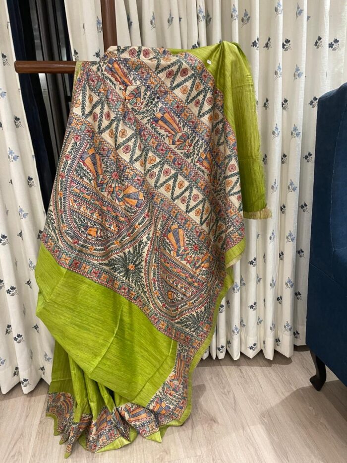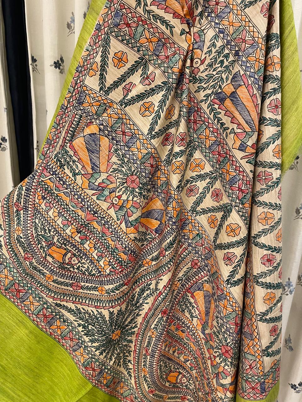 Pure gheecha Tussar silk with hand Madhubani paint.
