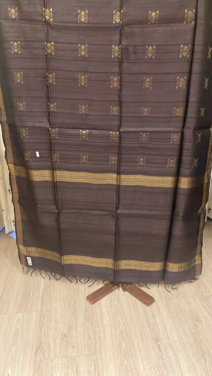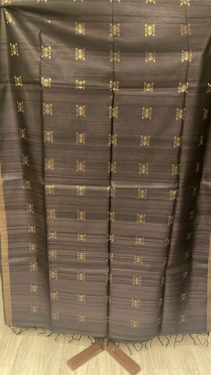 Drape yourself in timeless elegance with this charcoal-coloured pure Tussar silk saree, featuring a subtle 2-inch border for a minimalist yet refined look. The anchal is adorned with delicate zari work, adding just the right touch of shimmer and sophistication. Soft and lightweight, this saree comes with a matching blouse piece, ensuring comfort and grace for any occasion. Perfect for festive gatherings, formal events, or elegant evening wear, it blends classic tradition with understated luxury.