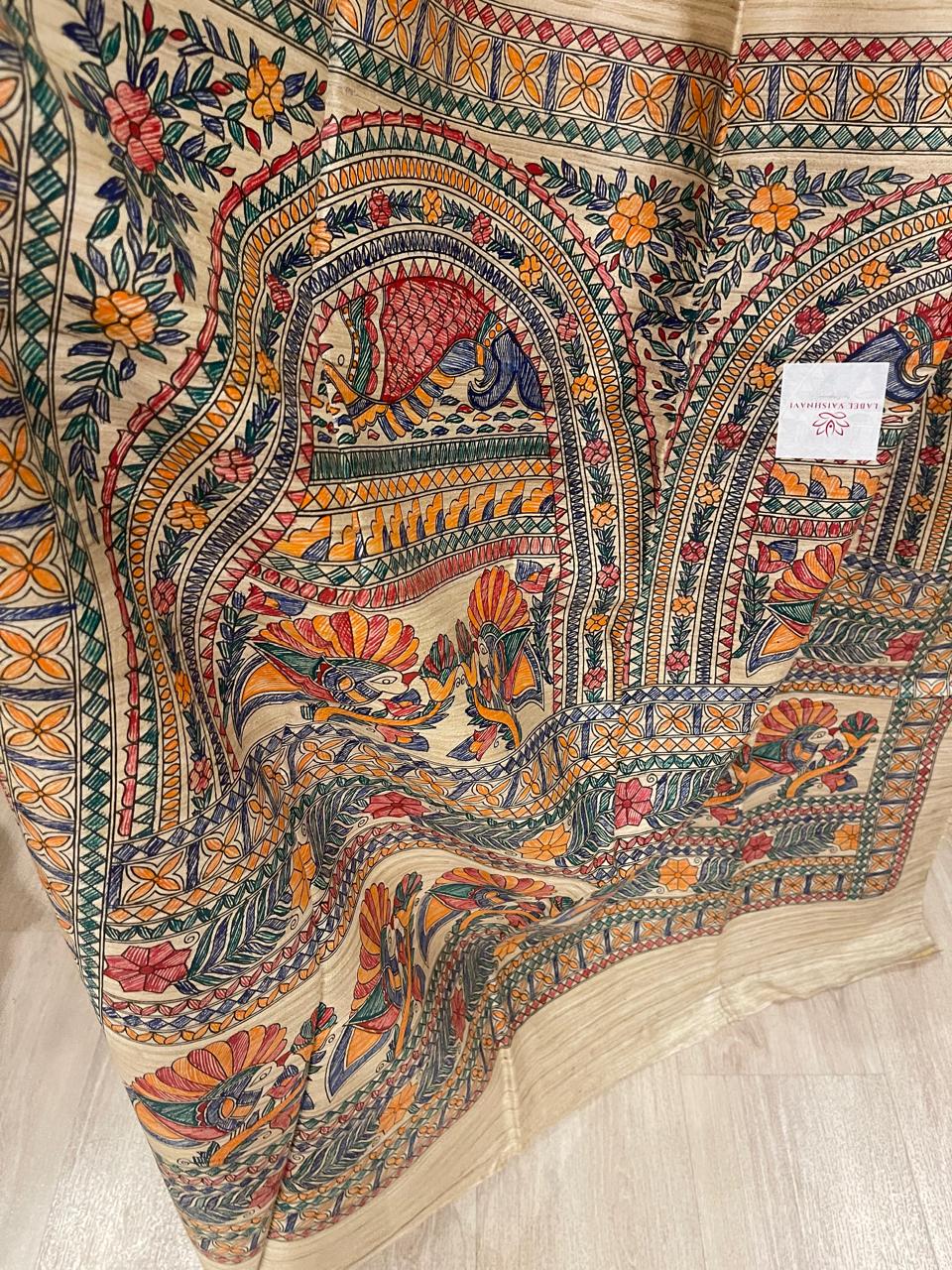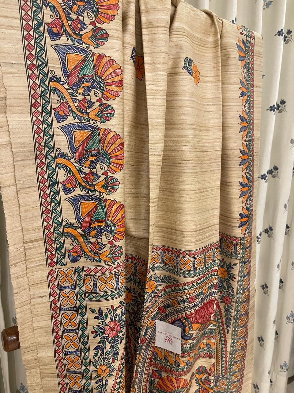 Pure gheecha Tussar silk with hand Madhubani paint.
