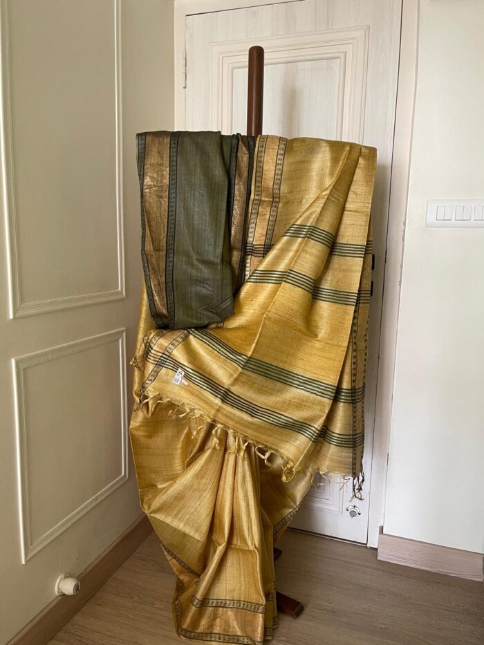 Pure Tussar with jari skirt border and cotton silk blouse piece.