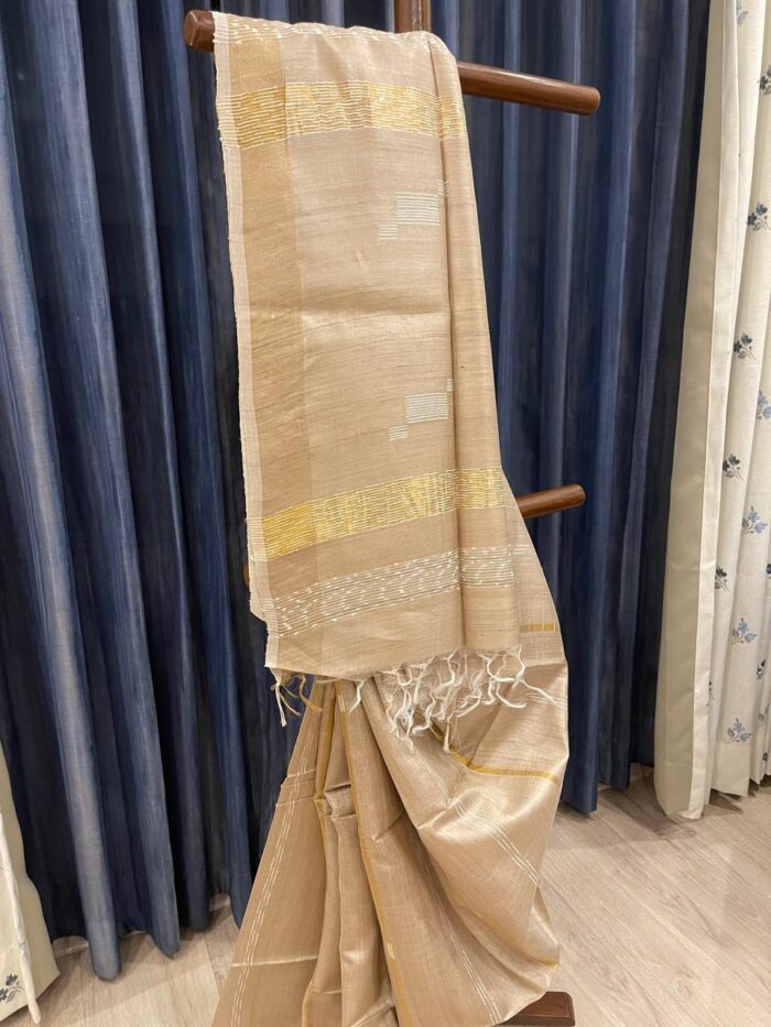 1 review for Pure soft texture natural colour Tussar with all over jari stripes and jamdani work.
