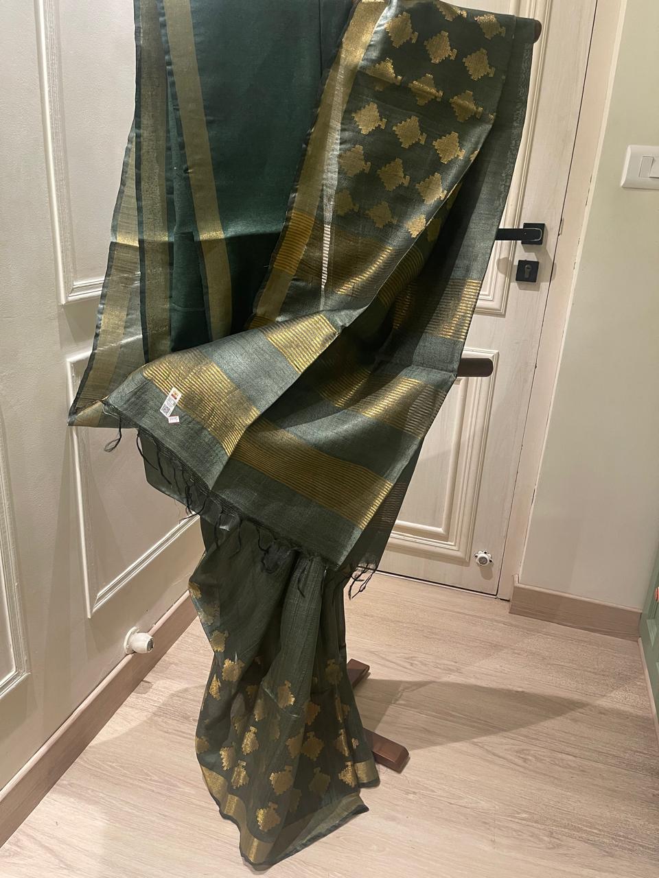 Elevate your ethnic style with this exquisite pure Tussar silk saree, beautifully highlighted by a shimmering zari skirt border that adds a touch of regal charm. The rich texture of Tussar silk drapes gracefully, offering both sophistication and comfort. Paired with a cotton-silk blouse piece, it balances tradition with contemporary elegance—perfect for festive celebrations, weddings, or formal gatherings.